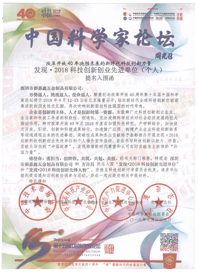 隆重紀(jì)念改革開放40周年第十五屆中國科學(xué)家論壇將于2018年9月12-13號在北京隆重召開,深圳市御嘉鑫五金制品有限公司董事長、總經(jīng)理方許昌先生,也將受邀參加此次中國科學(xué)家論壇!同各界人士一道,交流思想、展示成果,積極為中國科學(xué)創(chuàng)新事業(yè)的發(fā)展貢獻(xiàn)出自己的力量。