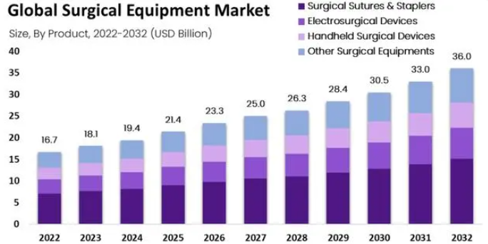 市場(chǎng)增長(zhǎng):手術(shù)設(shè)備市場(chǎng)預(yù)計(jì)到2032年將達(dá)到360億美元,從2022年的167億美元開始計(jì)算,年復(fù)合增長(zhǎng)率(CAGR)為8.2%。